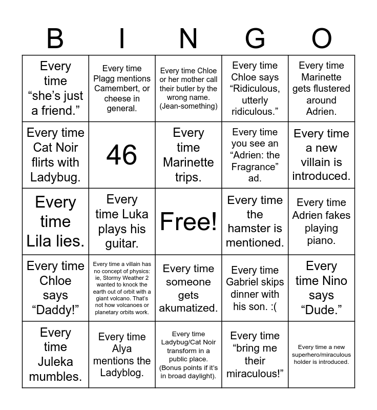 This bingo card has a free space and 26 words: Every time someone gets akumatized., Every time “bring me their miraculous!”, Every time Marinette trips., Every time Alya mentions the Ladyblog., Every time Marinette gets flustered around Adrien., Every time “she’s just a friend.”, Every time Cat Noir flirts with Ladybug., Every time Plagg mentions Camembert, or cheese in general., Every time Adrien fakes playing piano., Every time Gabriel skips dinner with his son. :(, Every time you see an “Adrien: the Fragrance” ad., Every time Lila lies., Every time Nino says “Dude.”, Every time Juleka mumbles., Every time Luka plays his guitar., Every time Jagged Stone says “rock and roll.”, Every time Chloe says “Ridiculous, utterly ridiculous.”, Every time Chloe says “Daddy!”, Every time Chloe or her mother call their butler by the wrong name. (Jean-something), Every time a new superhero/miraculous holder is introduced., Every time a new villain is introduced., Every time Ladybug/Cat Noir transform in a public place. (Bonus points if it’s in broad daylight)., Every time the hamster is mentioned., Every time a villain has no concept of physics: ie, Stormy Weather 2 wanted to knock the earth out of orbit with a giant volcano. That’s not how volcanoes or planetary orbits work., 46 and ·.