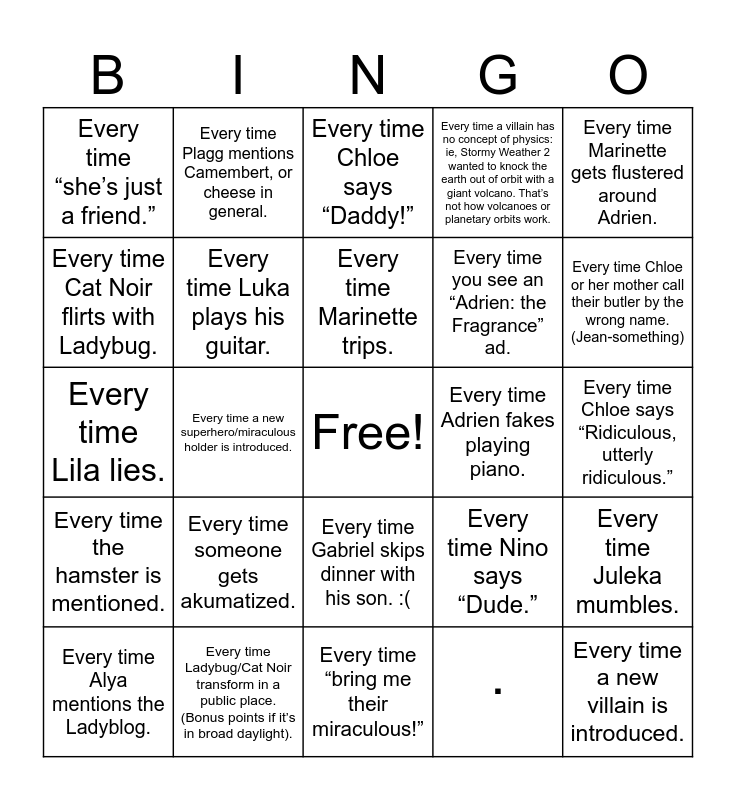 This bingo card has a free space and 25 words: Every time someone gets akumatized., Every time “bring me their miraculous!”, Every time Marinette trips., Every time Alya mentions the Ladyblog., Every time Marinette gets flustered around Adrien., Every time “she’s just a friend.”, Every time Cat Noir flirts with Ladybug., Every time Plagg mentions Camembert, or cheese in general., Every time Adrien fakes playing piano., Every time Gabriel skips dinner with his son. :(, Every time you see an “Adrien: the Fragrance” ad., Every time Lila lies., Every time Nino says “Dude.”, Every time Juleka mumbles., Every time Luka plays his guitar., Every time Jagged Stone says “rock and roll.”, Every time Chloe says “Ridiculous, utterly ridiculous.”, Every time Chloe says “Daddy!”, Every time Chloe or her mother call their butler by the wrong name. (Jean-something), Every time a new superhero/miraculous holder is introduced., Every time a new villain is introduced., Every time Ladybug/Cat Noir transform in a public place. (Bonus points if it’s in broad daylight)., Every time the hamster is mentioned., Every time a villain has no concept of physics: ie, Stormy Weather 2 wanted to knock the earth out of orbit with a giant volcano. That’s not how volcanoes or planetary orbits work. and ·.