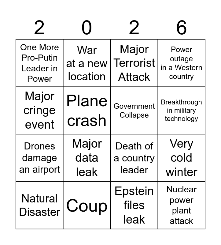This bingo card has 16 words: Natural Disaster, Coup, Major Terrorist Attack, Power outage in a Western country, Major cringe event, War at a new location, Death of a country leader, Very cold winter, One More Pro-Putin Leader in Power, Plane crash, Epstein files leak, Breakthrough in military technology, Drones damage an airport, Major data leak, Government Collapse and Nuclear power plant attack.