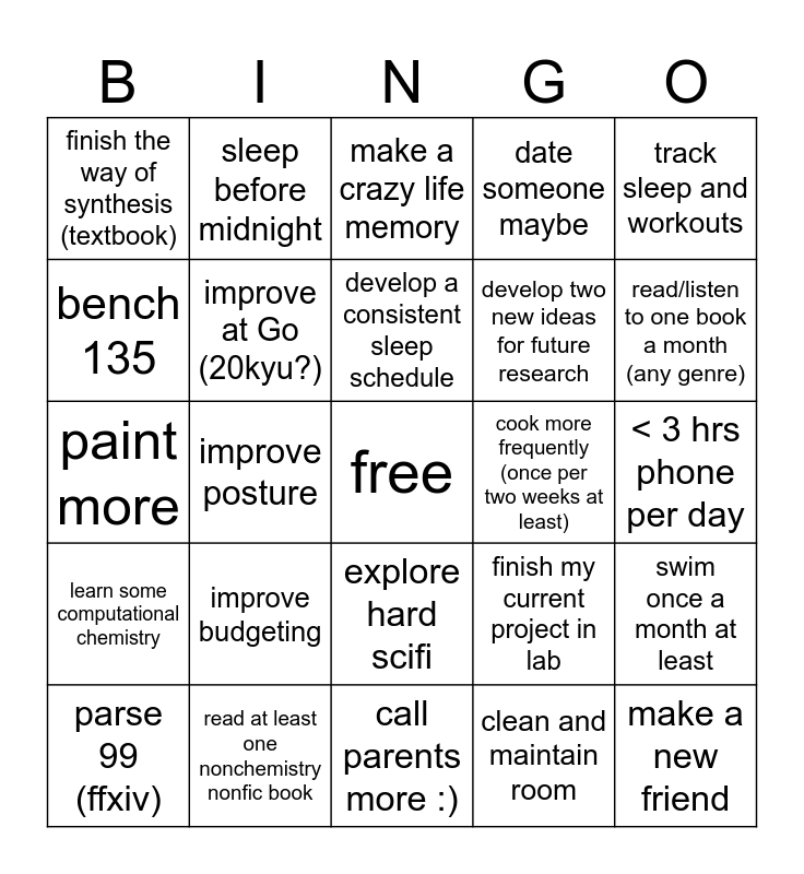 This bingo card has a free space and 24 words: improve budgeting, read at least one nonchemistry nonfic book, develop a consistent sleep schedule, parse 99 (ffxiv), track sleep and workouts, finish the way of synthesis (textbook), bench 135, sleep before midnight, cook more frequently (once per two weeks at least), explore hard scifi, develop two new ideas for future research, paint more, finish my current project in lab, swim once a month at least, improve at Go (20kyu?), clean and maintain room, < 3 hrs phone per day, make a crazy life memory, read/listen to one book a month (any genre), improve posture, make a new friend, learn some computational chemistry, date someone maybe and call parents more :).