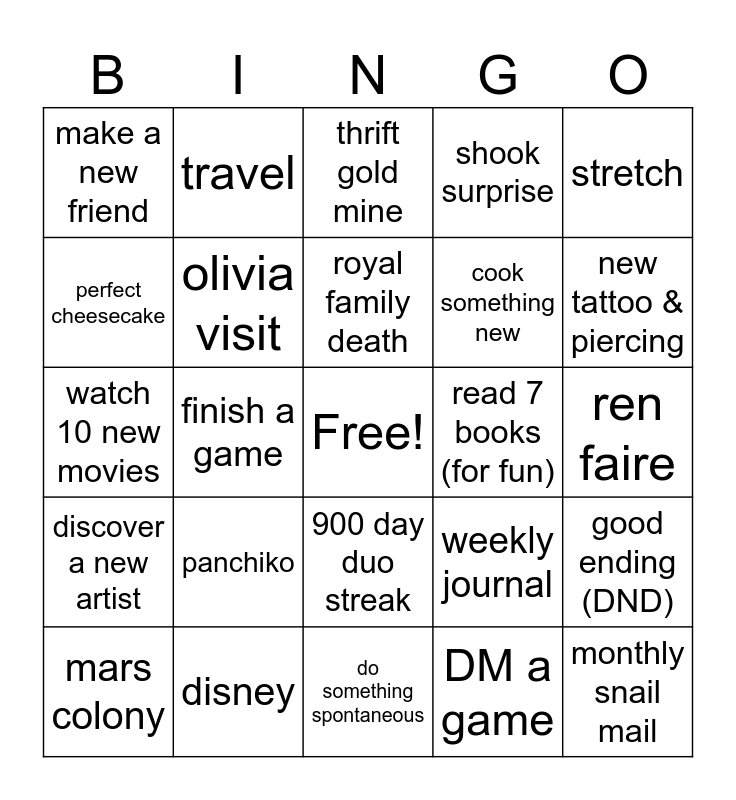 This bingo card has a free space and 24 words: panchiko, disney, royal family death, mars colony, stretch, make a new friend, perfect cheesecake, travel, read 7 books (for fun), 900 day duo streak, cook something new, watch 10 new movies, weekly journal, good ending (DND), olivia visit, DM a game, ren faire, thrift gold mine, new tattoo & piercing, finish a game, monthly snail mail, discover a new artist, shook surprise and do something spontaneous.