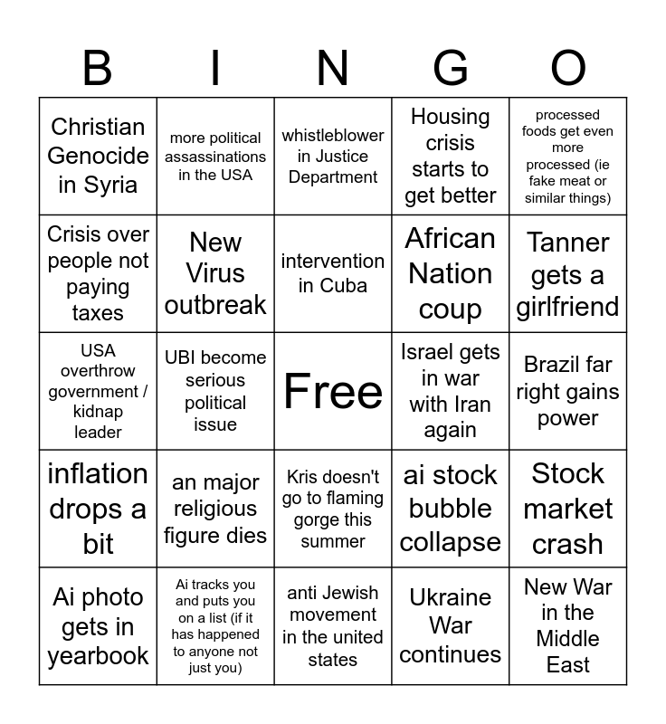 This bingo card has a free space and 49 words: republicans lose midterms, New War in the Middle East, Epstein files still in the news (by end of year), anti Jewish movement in the united states, an major religious figure dies, federal government keeps cracking down on crime, more political assassinations in the USA, terror attack in the united states, Crisis over people not paying taxes, digital ID in the United States, New Virus outbreak, Housing crisis starts to get better, Stock market crash, ai stock bubble collapse, ram gets cheaper, far right sabotage republican party, intervention in Cuba, Israel gets in war with Iran again, Everything you do is tracked by Ai, processed foods get even more processed (ie fake meat or similar things), UBI become serious political issue, Ukraine War continues, Christian Genocide in Syria, African Nation coup, Salt City Speed Shop goes viral, Tanner gets a girlfriend, Ai photo gets in yearbook, No snow at snow rally, Kris doesn't go to flaming gorge this summer, inflation drops a bit, blockade of Americas enemies, more strikes on foreign nations, far right gets in power in Europe / make major gains, Social Media restricts freedom of speech once again, Ai tracks you and puts you on a list (if it has happened to anyone not just you), Ukraine manpower issue, President of Ukraine replaced, Venezuela elects right wing government, Brazil far right gains power, Someone you know gets in car crash, Someone you know goes viral on social media, Salt City Speed Shop gets a shop, ai rights activism goes mainstream, Religious revival, USA overthrow government / kidnap leader, whistleblower in Justice Department, Constitutional issue arrives, Ai content becomes gets so real you can't trust videos anymore and Ai movies.
