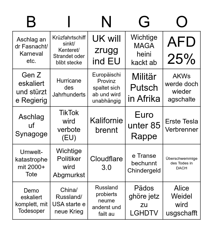 This bingo card has 25 words: Wichtige Politiker wird Abgmurkst, Russland probierts neume anderst und failt au, Europäischi Provinz spaltet sich ab und wird unabhängig, Demo eskaliert komplett, mit Todesoper, AFD 25%, Aschlag an dr Fasnacht/ Karneval etc., Gen Z eskaliert und stürzt e Regierig, Krüzfahrtschiff sinkt/ Kenteret/ Strandet oder blibt stecke, Euro unter 85 Rappe, Cloudflare 3.0, Militär Putsch in Afrika, Aschlag uf Synagoge, e Transe bechunnt Chindergeld, Überschwemmige des Todes in DACH, Hurricane des Jahrhunderts, Alice Weidel wird usgschafft, Erste Tesla Verbrenner, UK will zrugg ind EU, AKWs werde doch wieder agschalte, TikTok wird verbote (EU), Kalifornie brennt, China/ Russland/ USA starte e neue Krieg, Umwelt-katastrophe mit 2000+ Tote, Wichtige MAGA heini kackt ab and Pädos ghöre jetz zu LGHDTV.