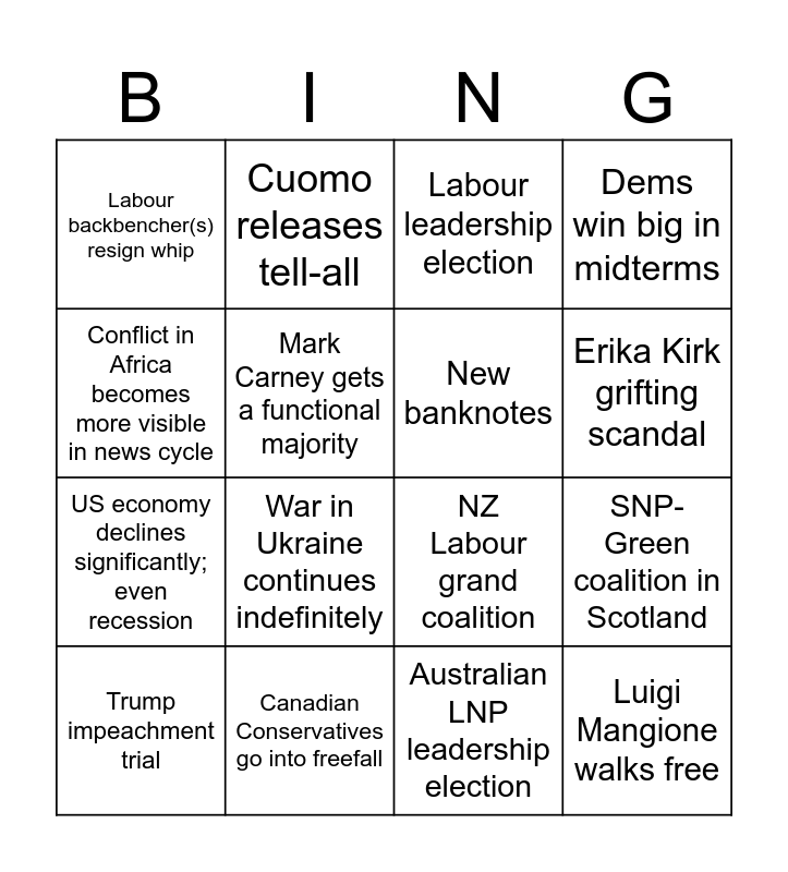 This bingo card has 17 words: Australian LNP leadership election, Trump impeachment trial, Labour leadership election, Labour backbencher(s) resign whip, War in Ukraine continues indefinitely, Dems win big in midterms, SNP-Green coalition in Scotland, New banknotes, Erika Kirk grifting scandal, Mark Carney gets a functional majority, Canadian Conservatives go into freefall, NZ Labour grand coalition, Conflict in Africa becomes more visible in news cycle, Cuomo releases tell-all, US economy declines significantly; even recession, Golden Charlie Kirk statue and Luigi Mangione walks free.