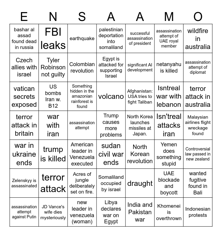 This bingo card has a free space and 48 words: war in ukraine ends, war with iran, new leader in venezuela (woman), sudan civil war ends, significant AI development, Isn'treal attacks iran, wildfire in australia, assassination attempt against Putin, US bombs Iran w. B12, assassination attempt, palestinian deportation into somaliland, successful assassination of president, Isntreal war with lebanon, terror attack in australia, terror attack in britain, terror attack, earthquake, volcano, draught, assassination attempt of UAE royal member, assassination attempt of diplomat, Czech allies with israel, FBI leaks, Colombian revolution, India and Pakistan war, netanyahu is killed, Malaysian airlines flight wreckage found, Zelenskyy is assassinated, trump is killed, Something hidden in the amazonian rainforest is found, Somaliland occupied by israel, Afghanistan: USA tries to fight Taliban, UAE blockade and boycott, wanted fugitive found in Bali, bashar al assad found dead in russia, JD Vance's wife dies mysteriously, American leader in Venezuela executed, Libya declares war on Egypt, North Korea launches missiles at Japan., Khomenei is overthrown, Controversial law passed in new zealand, vatican secrets exposed, Tyler Robinson not guilty, Acres of jungle deliberately set on fire., Egypt is attacked for supporting Israel, North Korean revolution, Yemen does something stupid and Indonesian protests.