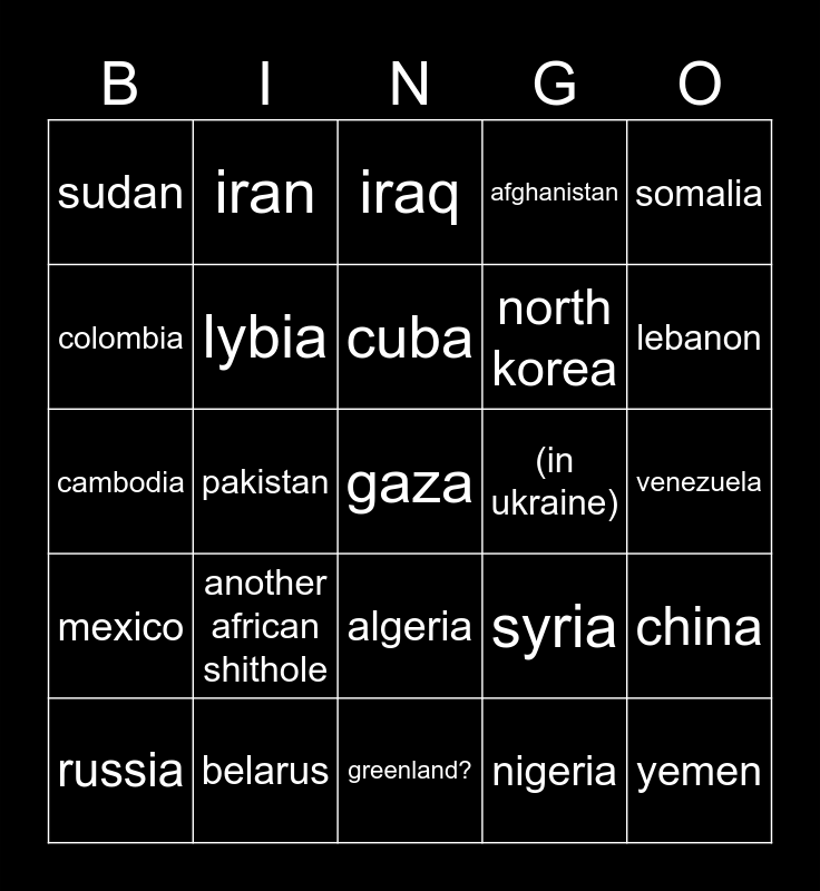 This bingo card has a free space and 24 words: another african shithole, belarus, cuba, russia, somalia, sudan, colombia, iran, (in ukraine), algeria, north korea, cambodia, syria, china, lybia, nigeria, venezuela, iraq, lebanon, pakistan, yemen, mexico, afghanistan and greenland?.