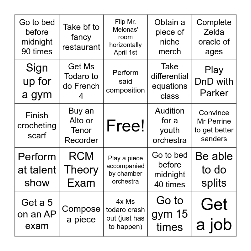 This bingo card has a free space and 24 words: RCM Theory Exam, Compose a piece, Perform said composition, Get a 5 on an AP exam, Complete Zelda oracle of ages, Go to bed before midnight 90 times, Sign up for a gym, Take bf to fancy restaurant, Audition for a youth orchestra, Play a piece accompanied by chamber orchestra, Take differential equations class, Finish crocheting scarf, Go to bed before midnight 40 times, Be able to do splits, Get Ms Todaro to do French 4, Go to gym 15 times, Convince Mr Perrine to get better sanders, Flip Mr. Melonas' room horizontally April 1st, Play DnD with Parker, Buy an Alto or Tenor Recorder, Get a job, Perform at talent show, Obtain a piece of niche merch and 4x Ms todaro crash out (just has to happen).