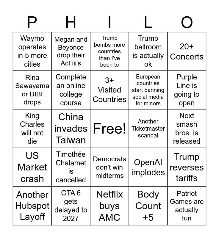 This bingo card has a free space and 24 words: Another Hubspot Layoff, Timothée Chalamet is cancelled, 3+ Visited Countries, Body Count +5, 20+ Concerts, Waymo operates in 5 more cities, Megan and Beyonce drop their Act iii's, Trump bombs more countries than I've been to, Another Ticketmaster scandal, Next smash bros. is released, King Charles will not die, Complete an online college course, OpenAI implodes, Trump reverses tariffs, Rina Sawayama or BIBI drops, GTA 6 gets delayed to 2027, Netflix buys AMC, Trump ballroom is actually ok, Purple Line is going to open, US Market crash, China invades Taiwan, Democrats don't win midterms, European countries start banning social media for minors and Patriot Games are actually fun.