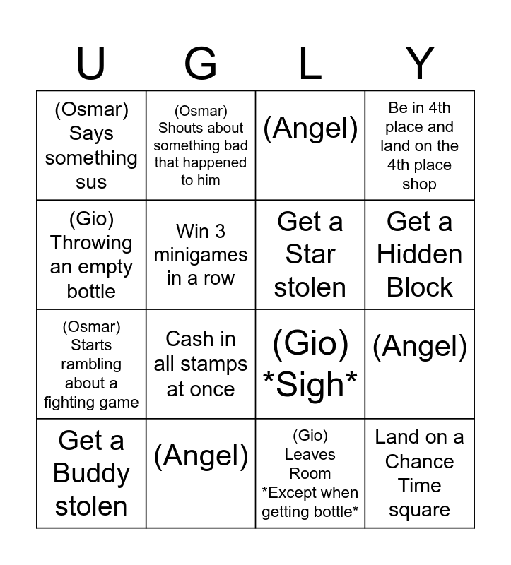 This bingo card has 16 words: (Angel), (Angel), (Angel), (Osmar) Says something sus, (Osmar) Starts rambling about a fighting game, (Osmar) Shouts about something bad that happened to him, (Gio) *Sigh*, (Gio) Leaves Room *Except when getting bottle*, (Gio) Throwing an empty bottle, Win 3 minigames in a row, Get a Buddy stolen, Be in 4th place and land on the 4th place shop, Cash in all stamps at once, Get a Hidden Block, Get a Star stolen and Land on a Chance Time square.