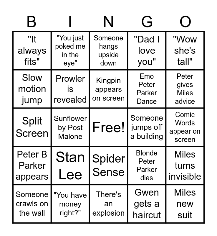 This bingo card has a free space and 24 words: Stan Lee, "You have money right?", Kingpin appears on screen, Someone crawls on the wall, "Wow she's tall", "It always fits", Slow motion jump, "You just poked me in the eye", Someone jumps off a building, Spider Sense, Emo Peter Parker Dance, Split Screen, Blonde Peter Parker dies, Miles turns invisible, Prowler is revealed, Gwen gets a haircut, Comic Words appear on screen, Someone hangs upside down, Peter gives Miles advice, Sunflower by Post Malone, Miles new suit, Peter B Parker appears, "Dad I love you" and There's an explosion.