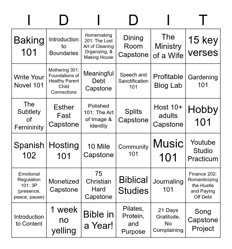 This bingo card has 36 words: Biblical Studies, 75 Christian Hard Capstone, Pilates, Protein, and Purpose, Write Your Novel 101, Spanish 102, Splits Capstone, Mothering 301: Foundations of Healthy Parent Child Connections, Bible in a Year!, The Ministry of a Wife, Journaling 101, Gardening 101, Dining Room Capstone, Finance 202: Romanticizing the Hustle and Paying Off Debt, Esther Fast Capstone, Speech and Sanctification 101, Baking 101, Emotional Regulation 101: 3P (presence, peace, pause), Host 10+ adults Capstone, The Subtlety of Femininity, Homemaking 201: The Lost Art of Cleaning Organizing, & Making House, Polished 101: The Art of Image & Identity, Hosting 101, Community 101, 10 Mile Capstone, Music 101, Introduction to Boundaries, Profitable Blog Lab, 1 week no yelling, Meaningful Debt Capstone, 15 key verses, Song Capstone Project, Introduction to Content, Youtube Studio Practicum, Hobby 101, Monetized Capstone and 21 Days Gratitude, No Complaining.