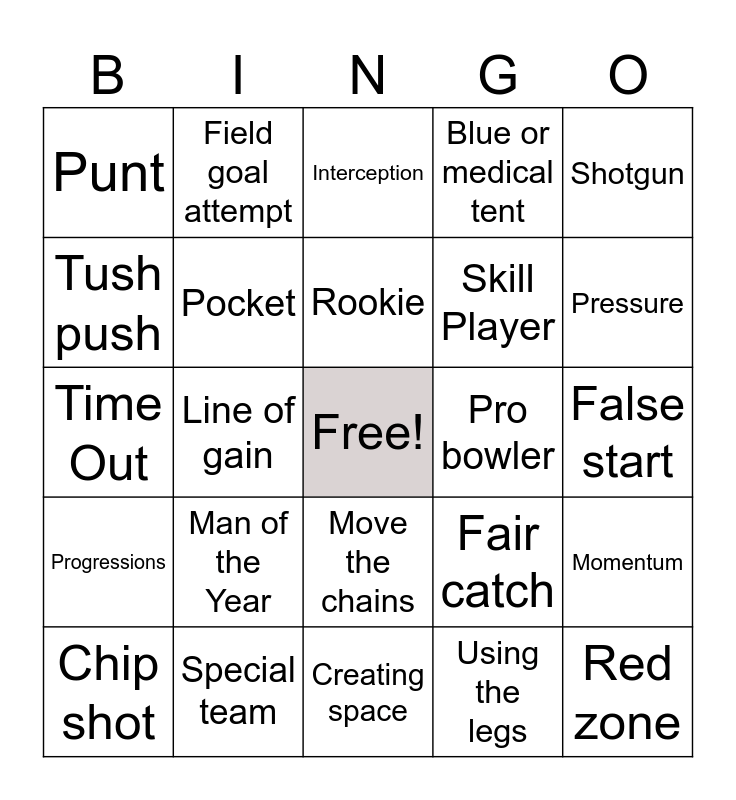 This bingo card has a free space and 40 words: Hall of Famer, Time Out, Play Action, Pocket, Special team, Move the chains, Rookie, Bootleg, Shotgun, Progressions, Line of gain, Blue or medical tent, Red zone, False start, Pro bowler, Man of the Year, Challenge Flag, Punt, Touchback, Interception, Momentum, Using the legs, Skill Player, Tush push, Fumble, Ball security, Roughing the passer, RPO, Holding, Personal Foul, No huddle, Chip shot, Chunk play, Fair catch, Pressure, Creating space, Sack, Interference, Field goal attempt and One score game.