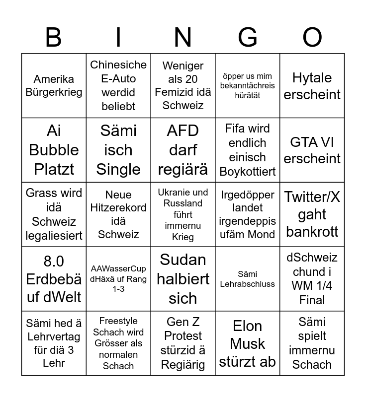 This bingo card has 25 words: AAWasserCup dHäxä uf Rang 1-3, Gen Z Protest stürzid ä Regiärig, AFD darf regiärä, Sämi hed ä Lehrvertag für diä 3 Lehr, Hytale erscheint, Amerika Bürgerkrieg, Ai Bubble Platzt, Chinesiche E-Auto werdid beliebt, Irgedöpper landet irgendeppis ufäm Mond, Sudan halbiert sich, Fifa wird endlich einisch Boykottiert, Grass wird idä Schweiz legaliesiert, Sämi Lehrabschluss, dSchweiz chund i WM 1/4 Final, Sämi isch Single, Sämi spielt immernu Schach, Twitter/X gaht bankrott, Weniger als 20 Femizid idä Schweiz, GTA VI erscheint, Neue Hitzerekord idä Schweiz, Ukranie und Russland führt immernu Krieg, Freestyle Schach wird Grösser als normalen Schach, 8.0 Erdbebä uf dWelt, öpper us mim bekanntächreis hürätät and Elon Musk stürzt ab.