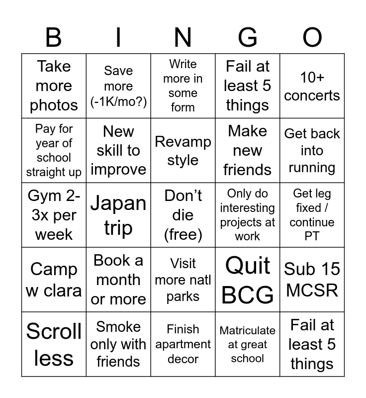 This bingo card has a free space and 24 words: Book a month or more, Smoke only with friends, Revamp style, Scroll less, 10+ concerts, Take more photos, Pay for year of school straight up, Save more (-1K/mo?), Only do interesting projects at work, Visit more natl parks, Make new friends, Gym 2-3x per week, Quit BCG, Sub 15 MCSR, New skill to improve, Matriculate at great school, Get leg fixed / continue PT, Write more in some form, Get back into running, Japan trip, Fail at least 5 things, Camp w clara, Fail at least 5 things and Finish apartment decor.