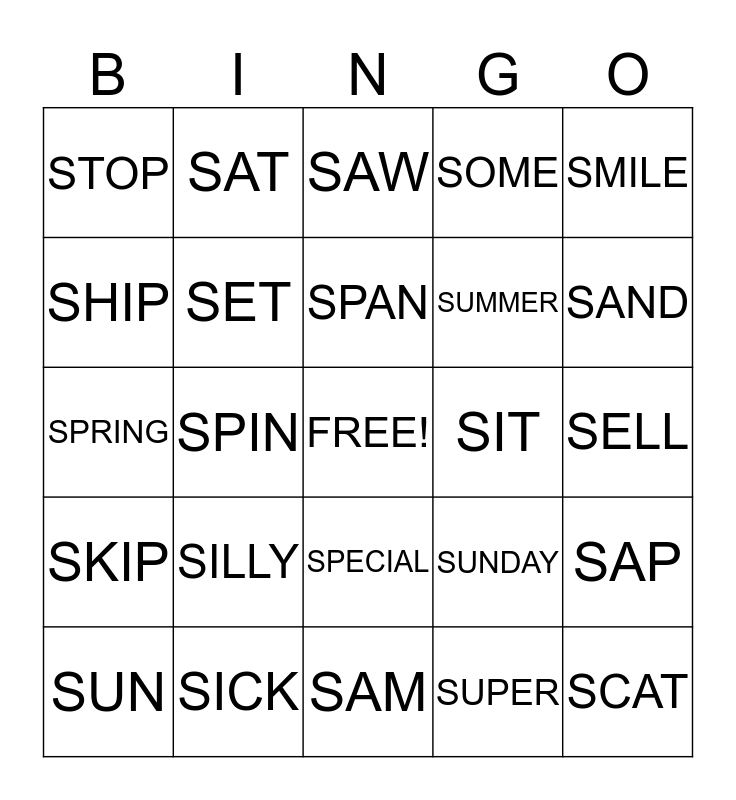This bingo card has a free space and 24 words: SILLY, SICK, SPAN, SUN, SMILE, STOP, SHIP, SAT, SIT, SPECIAL, SUMMER, SPRING, SUNDAY, SAP, SET, SUPER, SELL, SAW, SAND, SPIN, SCAT, SKIP, SOME and SAM.