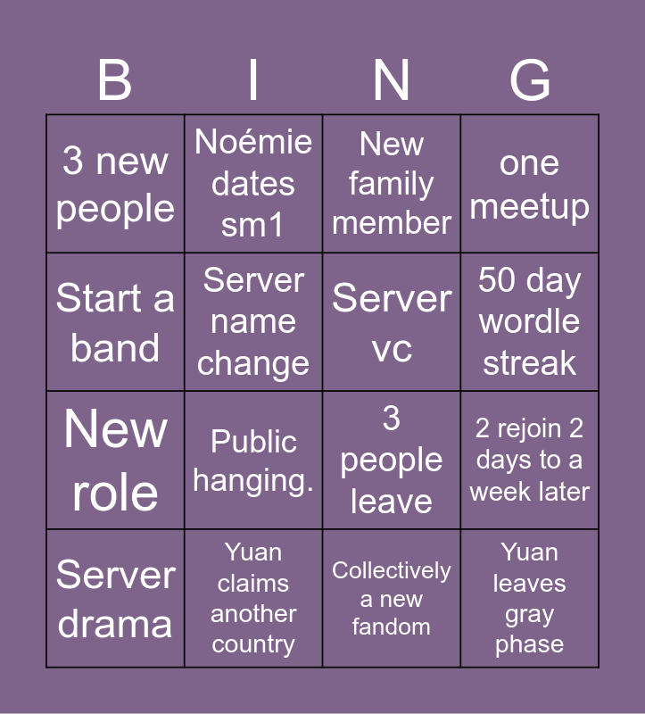 This bingo card has 16 words: Server drama, Yuan claims another country, New family member, one meetup, Start a band, Noémie dates sm1, 3 people leave, 2 rejoin 2 days to a week later, 3 new people, Server name change, Collectively a new fandom, 50 day wordle streak, New role, Public hanging., Server vc and Yuan leaves gray phase.