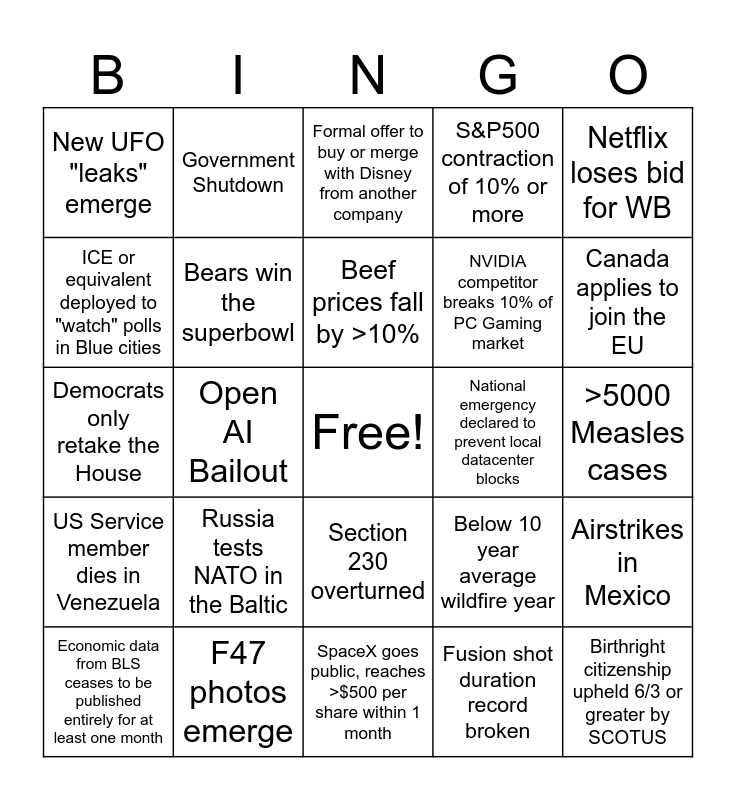 This bingo card has a free space and 24 words: Russia tests NATO in the Baltic, F47 photos emerge, Beef prices fall by >10%, Economic data from BLS ceases to be published entirely for at least one month, Netflix loses bid for WB, New UFO "leaks" emerge, ICE or equivalent deployed to "watch" polls in Blue cities, Government Shutdown, National emergency declared to prevent local datacenter blocks, Section 230 overturned, NVIDIA competitor breaks 10% of PC Gaming market, Democrats only retake the House, Below 10 year average wildfire year, Airstrikes in Mexico, Bears win the superbowl, Fusion shot duration record broken, >5000 Measles cases, Formal offer to buy or merge with Disney from another company, Canada applies to join the EU, Open AI Bailout, Birthright citizenship upheld 6/3 or greater by SCOTUS, US Service member dies in Venezuela, S&P500 contraction of 10% or more and SpaceX goes public, reaches >$500 per share within 1 month.