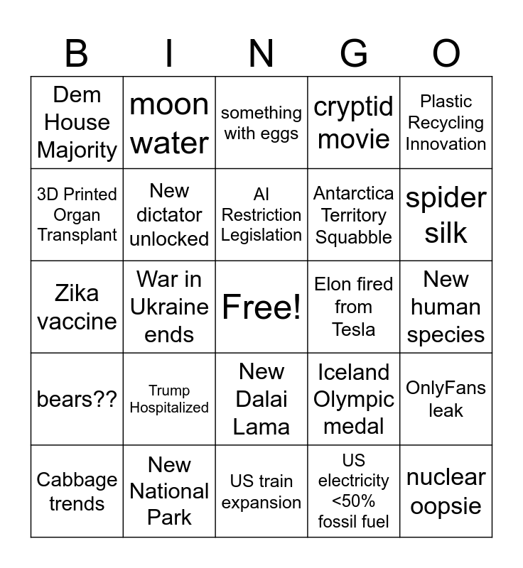 This bingo card has a free space and 24 words: Trump Hospitalized, New National Park, AI Restriction Legislation, Cabbage trends, Plastic Recycling Innovation, Dem House Majority, 3D Printed Organ Transplant, moon water, Elon fired from Tesla, New Dalai Lama, Antarctica Territory Squabble, Zika vaccine, Iceland Olympic medal, OnlyFans leak, New dictator unlocked, US electricity <50% fossil fuel, New human species, something with eggs, spider silk, War in Ukraine ends, nuclear oopsie, bears??, cryptid movie and US train expansion.