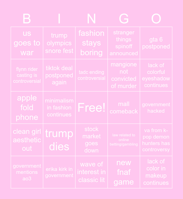 This bingo card has a free space and 24 words: trump dies, erika kirk in government, tadc ending controversial, government mentions ao3, gta 6 postponed, us goes to war, flynn rider casting is controversial, trump olympics snore fest, mall comeback, stock market goes down, mangione not convicted of murder, apple fold phone, law related to online betting/gambling, va from k-pop demon hunters has controversy, tiktok deal postponed again, new fnaf game, government hacked, fashion stays boring, lack of colorful eyeshadow continues, minimalism in fashion continues, lack of color in makeup continues, clean girl aesthetic out, stranger things spinoff announced and wave of interest in classic lit.