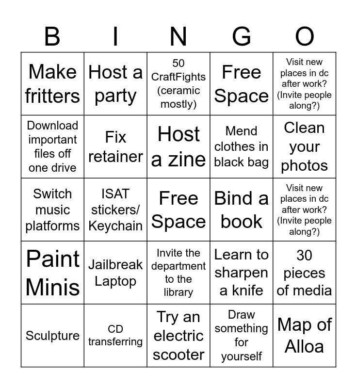 This bingo card has a free space and 24 words: Jailbreak Laptop, CD transferring, Host a zine, Sculpture, Visit new places in dc after work? (Invite people along?), Make fritters, Download important files off one drive, Host a party, Bind a book, Invite the department to the library, Mend clothes in black bag, Switch music platforms, Learn to sharpen a knife, 30 pieces of media, Fix retainer, Draw something for yourself, Visit new places in dc after work? (Invite people along?), 50 CraftFights (ceramic mostly), Clean your photos, ISAT stickers/ Keychain, Map of Alloa, Paint Minis, Free Space and Try an electric scooter.