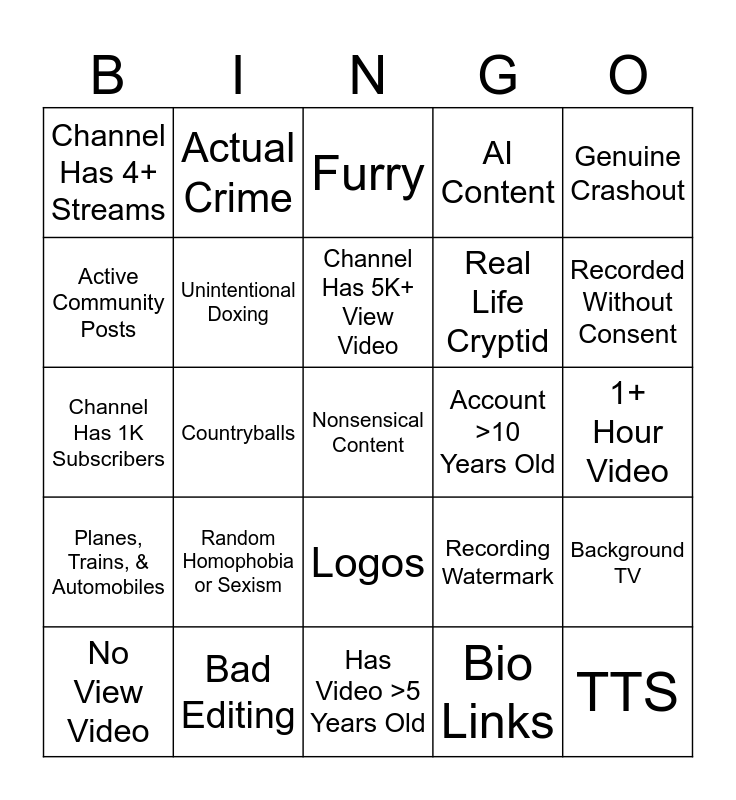 This bingo card has a free space and 24 words: Random Homophobia or Sexism, Bad Editing, Channel Has 5K+ View Video, No View Video, Genuine Crashout, Channel Has 4+ Streams, Active Community Posts, Actual Crime, Account >10 Years Old, Logos, Real Life Cryptid, Channel Has 1K Subscribers, Recording Watermark, Background TV, Unintentional Doxing, Bio Links, 1+ Hour Video, Furry, Recorded Without Consent, Countryballs, TTS, Planes, Trains, & Automobiles, AI Content and Has Video >5 Years Old.