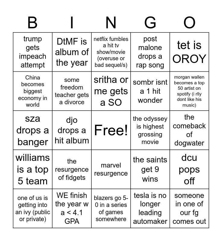 This bingo card has a free space and 24 words: the resurgence of fidgets, WE finish the year w a < 4.1 GPA, sritha or me gets a SO, one of us is getting into an ivy (public or private), tet is OROY, trump gets impeach attempt, China becomes biggest economy in world, DtMF is album of the year, the odyssey is highest grossing movie, marvel resurgence, sombr isnt a 1 hit wonder, sza drops a banger, the saints get 9 wins, dcu pops off, some freedom teacher gets a divorce, tesla is no longer leading automaker, the comeback of dogwater, netflix fumbles a hit tv show/movie (overuse or bad sequel/s), morgan wallen becomes a top 50 artist on spotify (i rlly dont like his music), djo drops a hit album, someone in one of our fg comes out, williams is a top 5 team, post malone drops a rap song and blazers go 5-0 in a series of games somewhere.