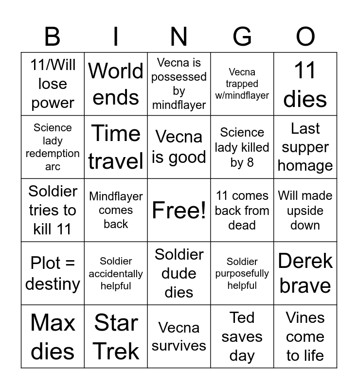 This bingo card has a free space and 33 words: Hopper dies, 8 dies, Mindflayer comes back, 8 = mindflayer, Plot = destiny, Time travel, 11 dies, Max dies, World ends, This IS the upside down, Vecna is good, Vecna is possessed by mindflayer, 11 = GOD/kids are disciples, 11 = Jesus, kids are disciples, 11 comes back from dead, Last supper homage, Star Trek, Soldier tries to kill 11, Soldier accidentally helpful, Soldier purposefully helpful, Soldier dude dies, Whole army dies, 11/Will lose power, Will made upside down, Vecna survives, Vines come to life, Vecna trapped w/mindflayer, Science lady killed by 8, Science lady redemption arc, Derek brave, Ted still useless, Ted saves day and Vecna=11's father.