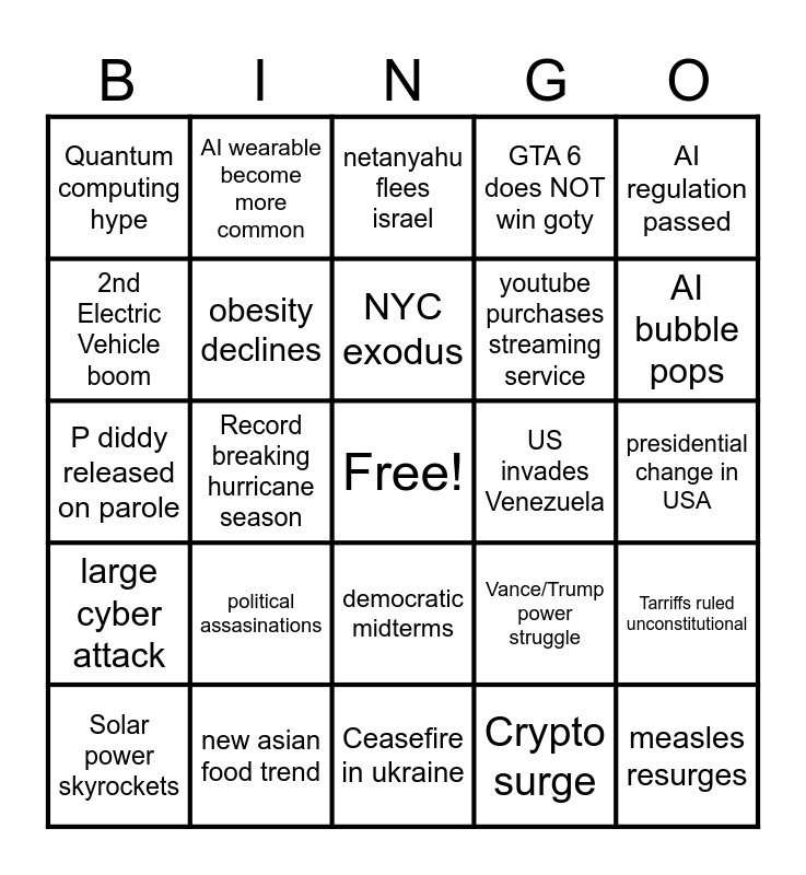 This bingo card has a free space and 24 words: political assasinations, new asian food trend, NYC exodus, Solar power skyrockets, AI regulation passed, Quantum computing hype, 2nd Electric Vehicle boom, AI wearable become more common, US invades Venezuela, democratic midterms, youtube purchases streaming service, P diddy released on parole, Vance/Trump power struggle, Tarriffs ruled unconstitutional, obesity declines, Crypto surge, presidential change in USA, netanyahu flees israel, AI bubble pops, Record breaking hurricane season, measles resurges, large cyber attack, GTA 6 does NOT win goty and Ceasefire in ukraine.
