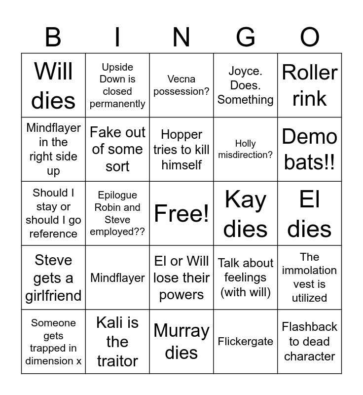 This bingo card has a free space and 24 words: Mindflayer, Kali is the traitor, Hopper tries to kill himself, Someone gets trapped in dimension x, Roller rink, Will dies, Mindflayer in the right side up, Upside Down is closed permanently, Kay dies, El or Will lose their powers, Holly misdirection?, Should I stay or should I go reference, Talk about feelings (with will), The immolation vest is utilized, Fake out of some sort, Flickergate, El dies, Vecna possession?, Demo bats!!, Epilogue Robin and Steve employed??, Flashback to dead character, Steve gets a girlfriend, Joyce. Does. Something and Murray dies.