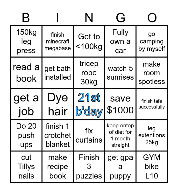 This bingo card has a free space and 24 words: finish 1 crotchet blanket, make recipe book, tricep rope 30kg, cut Tillys nails, go camping by myself, 150kg leg press, read a book, finish minecraft megabase, save $1000, fix curtains, watch 5 sunrises, get a job, keep ontop of diet for 1 month straight, leg extentions 25kg, get bath installed, get gpa a puppy, finish tafe successfully, Get to <100kg, make room spotless, Dye hair, GYM bike L10, Do 20 push ups, Fully own a car and Finish 3 puzzles.