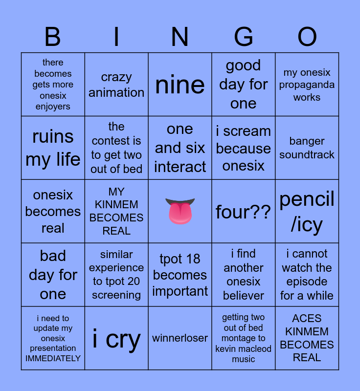 This bingo card has a free space and 24 words: similar experience to tpot 20 screening, i cry, one and six interact, i need to update my onesix presentation IMMEDIATELY, my onesix propaganda works, there becomes gets more onesix enjoyers, ruins my life, crazy animation, four??, tpot 18 becomes important, i scream because onesix, onesix becomes real, i find another onesix believer, i cannot watch the episode for a while, the contest is to get two out of bed, getting two out of bed montage to kevin macleod music, pencil /icy, nine, banger soundtrack, MY KINMEM BECOMES REAL, ACES KINMEM BECOMES REAL, bad day for one, good day for one and winnerloser.