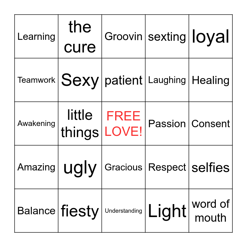 This bingo card has a free space and 50 words: You, word of mouth, Volunteering, Understanding, ugly, Timeless, the cure, Tenderness, Teamwork, Suprising, Sexy, sexting, selfies, Respect, Present, Playful, patient, Passion, Nurturing, loyal, little things, Light, Learning, Laughing, Inspiring, Healthy, Healing, haunting, Groovin, Gracious, Giving, furry, Friendship, Forgiveness, fiesty, Erotic, electric, Dancing, Crazy, Consent, Celebrating, Burning, Blue, Beautiful, Balance, Awakening, art, Appreciation, Amazing and a smile.