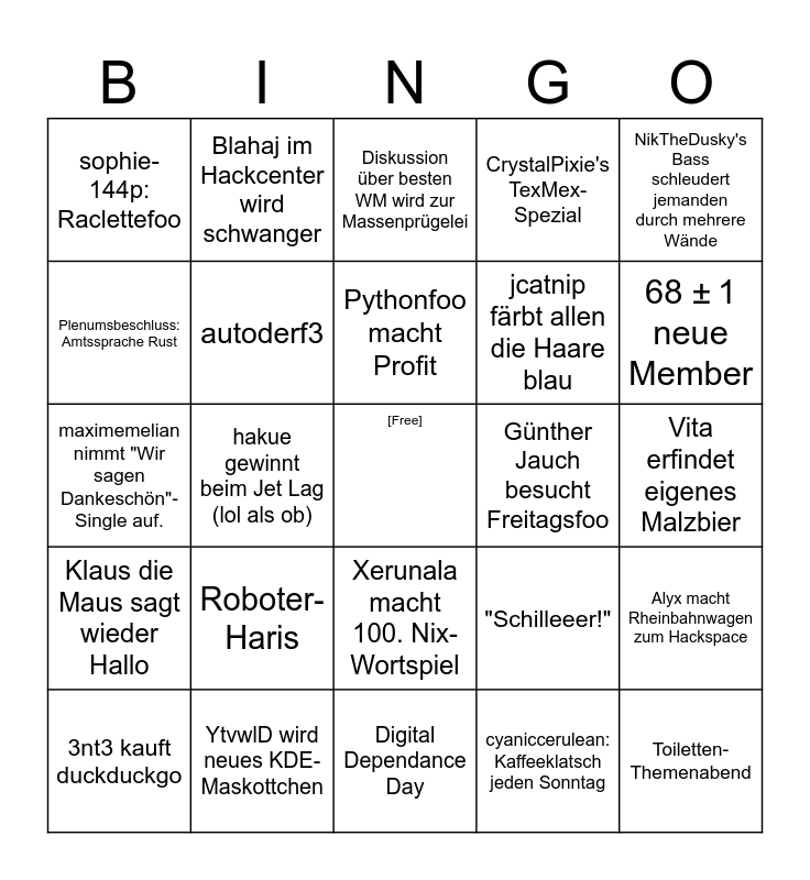 This bingo card has a free space and 24 words: Roboter-Haris, YtvwlD wird neues KDE-Maskottchen, Pythonfoo macht Profit, 3nt3 kauft duckduckgo, NikTheDusky's Bass schleudert jemanden durch mehrere Wände, sophie-144p: Raclettefoo, Plenumsbeschluss: Amtssprache Rust, Blahaj im Hackcenter wird schwanger, Günther Jauch besucht Freitagsfoo, Xerunala macht 100. Nix-Wortspiel, jcatnip färbt allen die Haare blau, maximemelian nimmt "Wir sagen Dankeschön"-Single auf., "Schilleeer!", Alyx macht Rheinbahnwagen zum Hackspace, autoderf3, cyaniccerulean: Kaffeeklatsch jeden Sonntag, Vita erfindet eigenes Malzbier, Diskussion über besten WM wird zur Massenprügelei, 68 ± 1 neue Member, hakue gewinnt beim Jet Lag (lol als ob), Toiletten-Themenabend, Klaus die Maus sagt wieder Hallo, CrystalPixie's TexMex-Spezial and Digital Dependance Day.