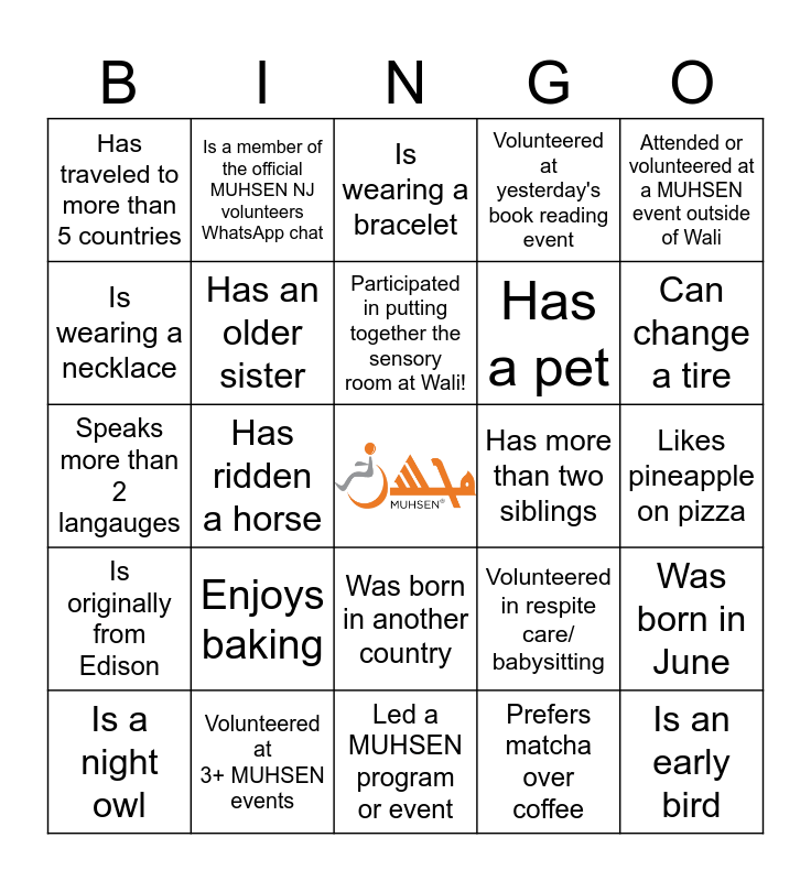 This bingo card has a free space and 24 words: Enjoys baking, Volunteered at 3+ MUHSEN events, Participated in putting together the sensory room at Wali!, Is a night owl, Attended or volunteered at a MUHSEN event outside of Wali, Has traveled to more than 5 countries, Is wearing a necklace, Is a member of the official MUHSEN NJ volunteers WhatsApp chat, Has more than two siblings, Was born in another country, Has a pet, Speaks more than 2 langauges, Volunteered in respite care/ babysitting, Was born in June, Has an older sister, Prefers matcha over coffee, Likes pineapple on pizza, Is wearing a bracelet, Can change a tire, Has ridden a horse, Is an early bird, Is originally from Edison, Volunteered at yesterday's book reading event and Led a MUHSEN program or event.