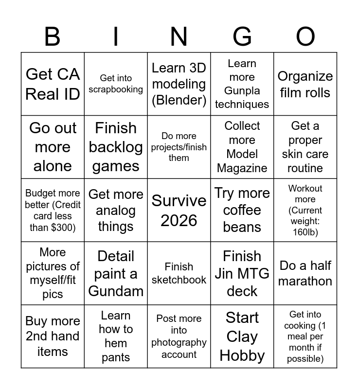 This bingo card has a free space and 24 words: Detail paint a Gundam, Learn how to hem pants, Do more projects/finish them, Buy more 2nd hand items, Organize film rolls, Get CA Real ID, Go out more alone, Get into scrapbooking, Try more coffee beans, Finish sketchbook, Collect more Model Magazine, Budget more better (Credit card less than $300), Finish Jin MTG deck, Do a half marathon, Finish backlog games, Start Clay Hobby, Workout more (Current weight: 160lb), Learn 3D modeling (Blender), Get a proper skin care routine, Get more analog things, Get into cooking (1 meal per month if possible), More pictures of myself/fit pics, Learn more Gunpla techniques and Post more into photography account.