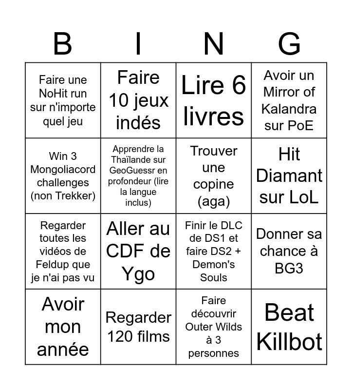 This bingo card has 16 words: Regarder 120 films, Donner sa chance à BG3, Lire 6 livres, Faire une NoHit run sur n'importe quel jeu, Regarder toutes les vidéos de Feldup que je n'ai pas vu, Faire 10 jeux indés, Finir le DLC de DS1 et faire DS2 + Demon's Souls, Faire découvrir Outer Wilds à 3 personnes, Win 3 Mongoliacord challenges (non Trekker), Apprendre la Thaïlande sur GeoGuessr en profondeur (lire la langue inclus), Avoir mon année, Avoir un Mirror of Kalandra sur PoE, Aller au CDF de Ygo, Hit Diamant sur LoL, Trouver une copine (aga) and Beat Killbot.