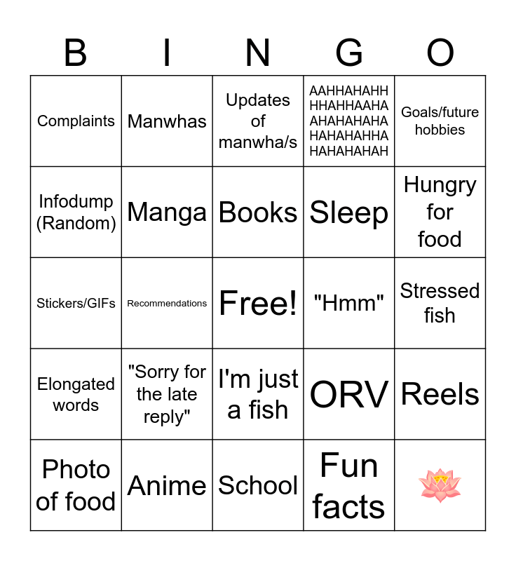 This bingo card has a free space and 24 words: "Sorry for the late reply", Anime, Books, Photo of food, Goals/future hobbies, Complaints, Infodump (Random), Manwhas, "Hmm", I'm just a fish, Sleep, Stickers/GIFs, ORV, Reels, Manga, Fun facts, Stressed fish, Updates of manwha/s, Hungry for food, Recommendations, 🪷, Elongated words, AAHHAHAHH HHAHHAAHA AHAHAHAHA HAHAHAHHA HAHAHAHAH and School.