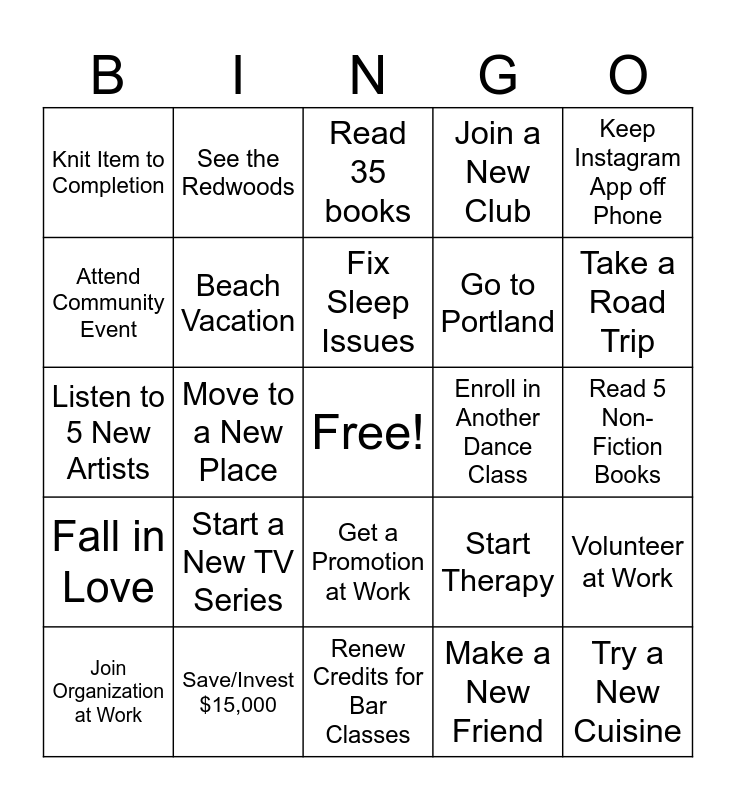 This bingo card has a free space and 30 words: Save/Invest $15,000, Save/Invest $30,000, Move to a New Place, Learn to Crochet, Knit Item to Completion, Read 35 books, Beach Vacation, Get a Promotion at Work, Enroll in Another Dance Class, Renew Credits for Bar Classes, Read 5 Non-Fiction Books, Try a New Cuisine, Make a New Friend, Visit 2 New Countries, Take a Road Trip, Solo Travel, Start Therapy, Fall in Love, Start a New TV Series, Keep Instagram App off Phone, Listen to 5 New Artists, Go to a Concert, See the Redwoods, Go to Portland, Attend Community Event, Join a New Club, Volunteer at Work, Join Organization at Work, Fix Sleep Issues and Take Mom on Dream Vacation.