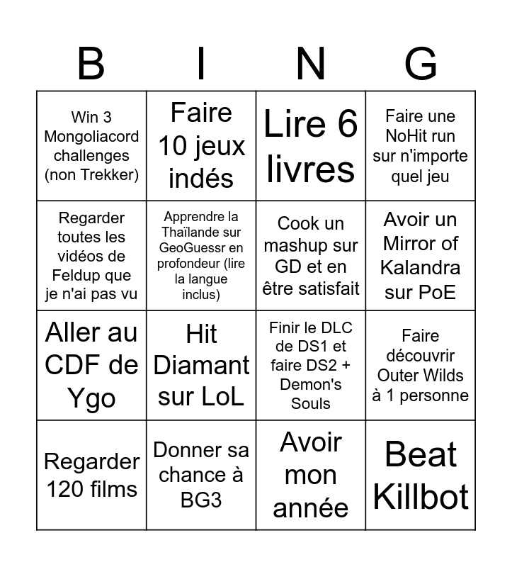 This bingo card has 16 words: Regarder 120 films, Donner sa chance à BG3, Lire 6 livres, Faire une NoHit run sur n'importe quel jeu, Regarder toutes les vidéos de Feldup que je n'ai pas vu, Faire 10 jeux indés, Finir le DLC de DS1 et faire DS2 + Demon's Souls, Faire découvrir Outer Wilds à 1 personne, Win 3 Mongoliacord challenges (non Trekker), Apprendre la Thaïlande sur GeoGuessr en profondeur (lire la langue inclus), Avoir mon année, Avoir un Mirror of Kalandra sur PoE, Aller au CDF de Ygo, Hit Diamant sur LoL, Cook un mashup sur GD et en être satisfait and Beat Killbot.