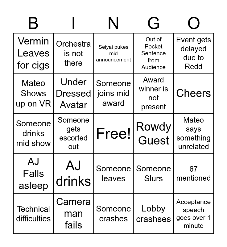 This bingo card has a free space and 24 words: AJ drinks, Camera man fails, Someone joins mid award, Technical difficulties, Event gets delayed due to Redd, Vermin Leaves for cigs, Mateo Shows up on VR, Orchestra is not there, Rowdy Guest, Someone leaves, Award winner is not present, Someone drinks mid show, Someone Slurs, 67 mentioned, Under Dressed Avatar, Lobby crashses, Mateo says something unrelated, Seiyai pukes mid announcement, Cheers, Someone gets escorted out, Acceptance speech goes over 1 minute, AJ Falls asleep, Out of Pocket Sentence from Audience and Someone crashes.