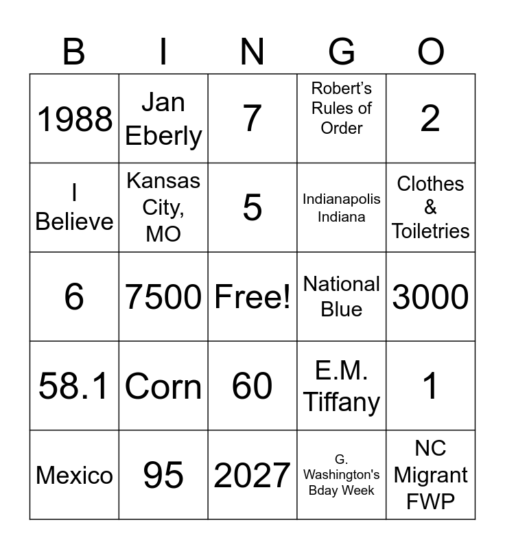This bingo card has a free space and 29 words: Mexico, Sweet Potatoes, 7500, 1928, 1988, 7, Kansas City, MO, Corn, National Blue, 95, 3000, NC Migrant FWP, 2027, G. Washington's Bday Week, Clothes & Toiletries, Jimmy Carter, 60, 58.1, 2, 6, E.M. Tiffany, Stand, Indianapolis Indiana, I Believe, Robert’s Rules of Order, Jan Eberly, 1, 5 and Cesar Chavez.
