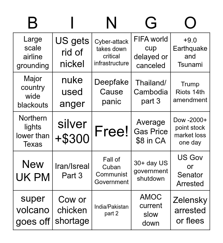 This bingo card has a free space and 24 words: Iran/Isreal Part 3, Cow or chicken shortage, Deepfake Cause panic, super volcano goes off, +9.0 Earthquake and Tsunami, Large scale airline grounding, Major country wide blackouts, US gets rid of nickel, Average Gas Price $8 in CA, Fall of Cuban Communist Government, Thailand/ Cambodia part 3, Northern lights lower than Texas, 30+ day US government shutdown, US Gov or Senator Arrested, nuke used anger, AMOC current slow down, Dow -2000+ point stock market loss one day, Cyber-attack takes down critical infrastructure, Trump Riots 14th amendment, silver +$300, Zelensky arrested or flees, New UK PM, FIFA world cup delayed or canceled and India/Pakistan part 2.
