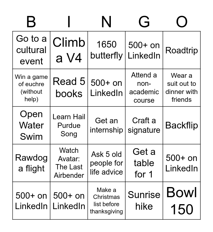 This bingo card has 30 words: 500+ on LinkedIn, Befriend a professor, Learn Hail Purdue Song, Half Ironman, Go to a cultural event, 1650 butterfly, Read 5 books, Ask 5 old people for life advice, Craft a signature, Make a Christmas list before thanksgiving, Backflip, Get an internship, Sunrise hike, Bowl 150, Wear a suit out to dinner with friends, Add 52 songs to playlist, Get a table for 1, Rawdog a flight, Watch Avatar: The Last Airbender, Roadtrip, Open Water Swim, Learn to hacky sack, Climb a V4, Attend a non-academic course, Win a game of euchre (without help), 500+ on LinkedIn, 500+ on LinkedIn, 500+ on LinkedIn, 500+ on LinkedIn and 500+ on LinkedIn.