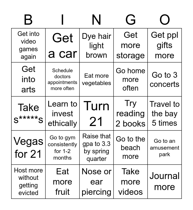 This bingo card has a free space and 24 words: Go to gym consistently for 1-2 months, Eat more fruit, Eat more vegetables, Host more without getting evicted, Get ppl gifts more, Get into video games again, Get into arts, Get a car, Try reading 2 books, Raise that gpa to 3.3 by spring quarter, Go home more often, Take s*****s, Go to the beach more, Go to an amusement park, Schedule doctors appointments more often, Take more videos, Travel to the bay 5 times, Dye hair light brown, Go to 3 concerts, Learn to invest ethically, Journal more, Vegas for 21, Get more storage and Nose or ear piercing.