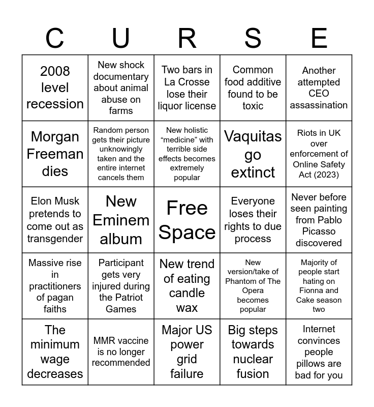 This bingo card has a free space and 24 words: Participant gets very injured during the Patriot Games, MMR vaccine is no longer recommended, New holistic “medicine” with terrible side effects becomes extremely popular, The minimum wage decreases, Another attempted CEO assassination, 2008 level recession, Morgan Freeman dies, New shock documentary about animal abuse on farms, Everyone loses their rights to due process, New trend of eating candle wax, Vaquitas go extinct, Elon Musk pretends to come out as transgender, New version/take of Phantom of The Opera becomes popular, Majority of people start hating on Fionna and Cake season two, Random person gets their picture unknowingly taken and the entire internet cancels them, Big steps towards nuclear fusion, Never before seen painting from Pablo Picasso discovered, Two bars in La Crosse lose their liquor license, Riots in UK over enforcement of Online Safety Act (2023), New Eminem album, Internet convinces people pillows are bad for you, Massive rise in practitioners of pagan faiths, Common food additive found to be toxic and Major US power grid failure.