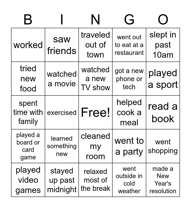 This bingo card has a free space and 24 words: learned something new, stayed up past midnight, watched a new TV show, played video games, slept in past 10am, worked, tried new food, saw friends, helped cook a meal, cleaned my room, got a new phone or tech, spent time with family, went to a party, went shopping, watched a movie, went outside in cold weather, read a book, traveled out of town, played a sport, exercised, made a New Year's resolution, played a board or card game, went out to eat at a restaurant and relaxed most of the break.