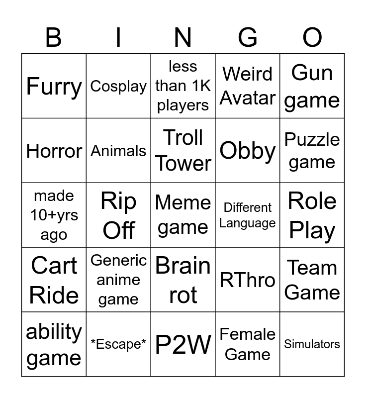 This bingo card has 25 words: Generic anime game, P2W, Troll Tower, ability game, Gun game, Furry, Horror, Cosplay, Different Language, Brain rot, Obby, made 10+yrs ago, RThro, Team Game, Animals, Simulators, Role Play, less than 1K players, Puzzle game, Rip Off, Meme game, *Escape*, Cart Ride, Weird Avatar and Female Game.