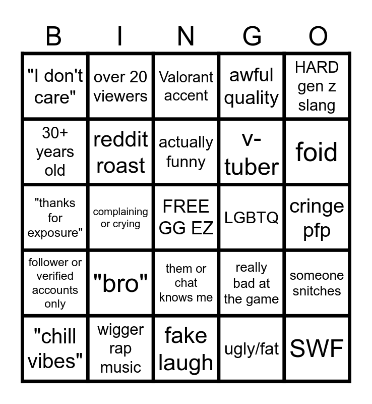 This bingo card has a free space and 24 words: "bro", wigger rap music, actually funny, "chill vibes", HARD gen z slang, "I don't care", 30+ years old, over 20 viewers, LGBTQ, them or chat knows me, v-tuber, "thanks for exposure", really bad at the game, someone snitches, reddit roast, ugly/fat, cringe pfp, Valorant accent, foid, complaining or crying, SWF, follower or verified accounts only, awful quality and fake laugh.