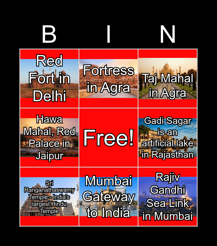 This bingo card has 10 images, a free space and 10 words: Mumbai Gateway to India, Taj Mahal in Agra, Red Fort in Delhi, Rajiv Gandhi Sea Link in Mumbai, Hawa Mahal, Red Palace in Jaipur, Sri Ranganathaswamy Temple - India's largest Hindu Temple, Fortress in Agra, Lotus Temple - Baha'i House of Worship, Gadi Sagar is an artificial lake in Rajasthan and Palolem Beach in Goa.
