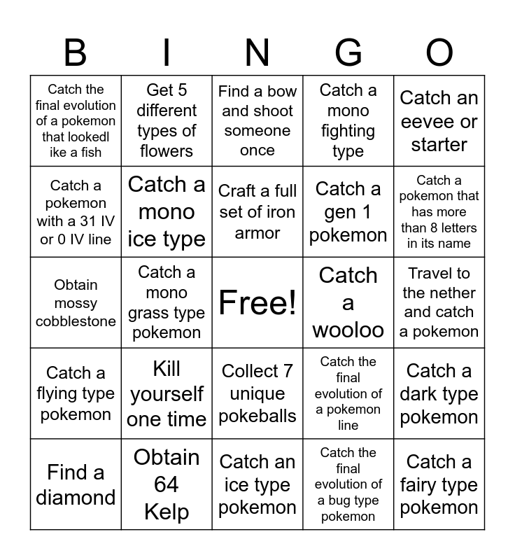 This bingo card has a free space and 49 words: Catch a psuedo, legendary, or paradox, Catch a fairy type pokemon, Catch a pokemon twice the size of you, Catch an ice type pokemon, Kill yourself one time, Catch a normal type pokemon, Get 5 different types of flowers, Catch a dragon type pokemon, Catch a pokemon with a 31 IV or 0 IV line, Catch a psychic type, Catch a mono ice type, Catch a mono fighting type, Catch a dark type pokemon, Catch the final evolution of a pokemon line, Catch a pokemon that does not evolve, Catch a pokemon from the nether, Craft a full set of iron armor, Catch a wooloo, Catch a mono fire type pokemon, Catch an eevee or starter, Catch a mono grass type pokemon, Catch the final evolution of a bug type pokemon, Catch the final evolution of a pokemon that lookedl ike a fish, Catch a gen 1 pokemon, Catch a pokemon that has 6 letters exactly in its name, Catch a pokemon that has more than 8 letters in its name, Find a diamond, Harvest 10 pumpkins or melon blocks, Collect 7 unique pokeballs, Catch a flying type pokemon, Catch a shiny pokemon, Collect 5 of the same pokemon, Catch a pokemon with the nature Docile, Hardy, or Quirky, Craft 3 stacks of oak stairs, Obtain 64 Kelp, Get 20 Flint, Catch a pokemon that is long, Catch a mountable pokemon, Travel to the nether and catch a pokemon, Find a book and quil, and fill up 3 pages with 67, Collect 4 different types of sapplings, Catch a ghost type pokemon, Catch a ground type pokemon, Catch an electric type pokemon, Obtain mossy cobblestone, Find a bow and shoot someone once, Craft a wooden, stone, iron, gold, and diamond shovel, Obtain the full evolution line of a pokemon and Obtain 5 different edible foods.